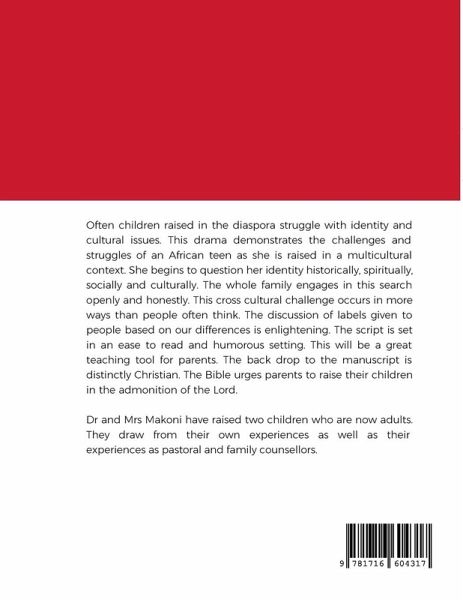 A dramatized rendition of the struggles that an African child in the Diaspora goes through in dealing with her historical, spiritual, social and cultural identity. It considers issues of identity, cultural assimilation and perceptions of differences due to culture. It surfaces assumptions that people have of those who are different to themselves.