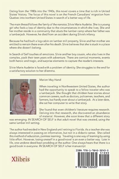 Marion May Hand When traveling in Northwestern United States, the author had the opportunity to speak to a fellow traveler who was a lumberjack. She thought that children hear stories about common careers, such as doctors, policemen, teachers, and farmers, but hardly ever about a lumberjack. At a later date, she sat her computer to write that story. She found that even children's literature requires research. Delving into that research, she discovered an abundance of material. However, she soon knew that a different story was emerging. IN SEARCH OF SELF is that adult novel that was created, using the same lumber mill setting. The author had resided in New England until retiring to Florida. As a teacher she was always interested in passing on information, but not in a didactic sense. She called this method of education, painless learning. Traveling is one way of learning by using little effort. However, losing oneself in a good novel is an even a better way. Late in life, one undone deed kept prodding at the author. One always hears that there is a good book in everyone. IN SEARCH OF SELF is her manuscript