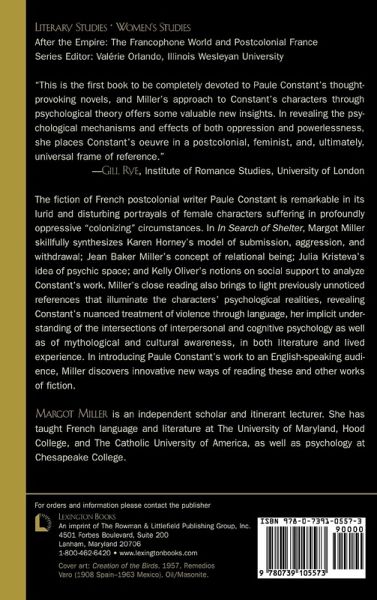 This is the first book to be completely devoted to Paule Constant's thought-provoking novels, and Miller's approach to Constant's characters through psychological theory offers some valuable new insights. In revealing the psychological mechanisms and effects of both oppression and powerlessness, she places Constant's oeuvre in a postcolonial, feminist, and, ultimately, universal frame of reference. -- Gill Rye, Institute of Romance Studies, University of London Margot Miller?s convincing study combines a psychological interpretation of Paule Constant?s ?psychic? spaces and ?neurotic? characters with thematic analyses of her postcolonial fictional world. This approach successfully conveys the complexity and richness of Constant?s novels, to which In Search of Shelter constitutes an excellent introduction... -- Pierre Verdaguer In Search of Shelter is an important contribution to postcolonial studies. Journal Of The Association For Research On Mothering, Fall / Winter 2005 ... intelligent, thoughtful, and straightforward... Readers can look forward to more in-depth analysis in Miller's future books, as her knowledge and understanding of Constant's characters, coulpled with her distinguished background in psychology, will undoubtedly yield additional and equally keen insights tht will aid in the examination, appreciation and teaching of Paule Constant's provocative and enigmatic fiction. International Journal Of Francophone Studies Margot Miller's convincing study combines a psychological interpretation of Paule Constant's "psychic" spaces and "neurotic" characters with thematic analyses of her postcolonial fictional world. This approach successfully conveys the complexity and richness of Constant's novels, to which In Search of Shelter constitutes an excellent introduction. -- Pierre Verdaguer