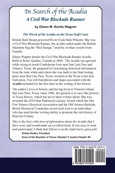 British Built Steam powered River-Clyde Side Wheeler. She was a Civil War Blockade Runner, the Acadia sailed under the British Maritime flag the "Red Ensign," used by civilian vessels from Canada. Eileen Wagner details the Civil War Blockade Runner Acadia. Built in Sorel, Quebec, Canada in 1864. The "Acadia" an aground while trying to reach Confederate forts near San Luis Pass and Velasco, Texas. Be prepared for fascinating historical information from the time when and where she was built to her final resting place near San Luis Pass, Texas, located on the Texas coast near Galveston. You will find photos and maps associated with the Acadia included for the first time in the writing of her history. The author's love of history and having lived at Treasure Island, San Luis Pass, Texas, since 1981, her passion is to save this portion of Texas history, which has never been written about. She was awarded the 2019 Dan Parkinson Literary Award which the Old Fort Velasco Historical Association and the Old Velasco/Surfside Beach Historical Committee award each year to an individual who has used his/her writing ability to promote the rich history of Brazoria County.