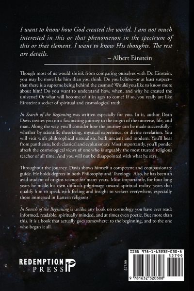 Do you believe--or at least suspect--that there is a Supreme Being behind the cosmos? Would you like to know more about him? Do you want to understand how, when, and why he created the universe? Or what will become of it in ages to come? If so, In Search of the Beginning was written especially for you. In it, author Dean Davis invites seekers of cosmological truth on a fascinating journey to the origin of the universe, life, and man. Along the way, you'll consider how the journey can be made successfully--whether by scientific theorizing, mystical experience, or divine revelation. You will visit with philosophical naturalists, both ancient and modern. You'll hear from pantheists, both classical and evolutionary. But most importantly, you'll ponder afresh the cosmological views of one who is arguably the most trusted religious Teacher of all time. And you will not be disappointed with what he says. Throughout the journey, Davis shows himself a competent and compassionate guide. He holds degrees in both Philosophy and Theology, and has been an avid student of origins science for many years. Also, for four long years he made his own difficult pilgrimage toward spiritual reality--years that qualify him to speak with feeling and insight to seekers everywhere, especially those immersed in Eastern religions. In Search of the Beginning is unlike any book on cosmology you have ever read: informed, readable, spiritually minded, and at times even poetic. But more than this, it is a book that actually goessomewhere: to the beginning, and to the one who began it all!
