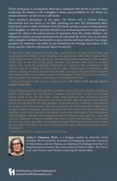 When the archetypal patriarchal or matriarchal dominate in a daughter's psyche, the positive masculine spirit does not mature sufficiently out of the maternal unconscious for there to be an optimal meeting between feminine and masculine principles. It becomes difficult for a more conscious, well-integrated, whole human being to develop. Where inadequate or incompetent fathering is combined with absent or passive, silent mothering, the balance is off; a daughter's talents and possibilities for the future can remain dormant-or fade away in self-doubt. These analytical discussions of two plays, The Heiress and A Delicate Balance, demonstrate how too much or too little parenting can have this detrimental effect. Particularly, when a father withdraws from the family and does not give loving attention to his daughter, or when he presents himself as an overbearing elder, he is neglecting to support his child in the natural process of separation from the mother/Mother-not helping her achieve personal autonomy and an individual life of her own. As an adult, such a daughter will likely find herself in a place not directed from within by her unique potential for wholeness, but rather in one dictated by the limiting expectations of her family and the collective patriarchal culture around her. Table of Contents -Preface -Introduction: Myth and Culture -The Daughter with an Emotionally Hostile Father: The Heiress by Ruth and Augustus Goetz -The Daughter with An Emotionally Absent Father: A Delicate Balance by Edward Albee -Concluding Remarks -References