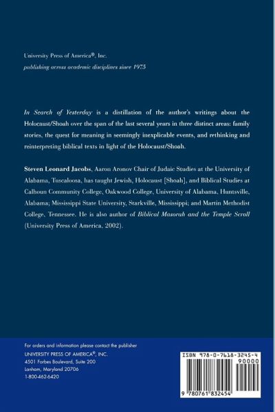 In Search of Yesterday is a distillation of the author's writings about the Holocaust / Shoah over the span of the last several years in three distinct areas: family stories, the quest for meaning in seemingly inexplicable events, and rethinking and reinterpreting biblical texts in light of the Holocaust / Shoah.