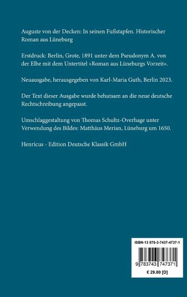Auguste von der Decken: In seinen Fußstapfen. Historischer Roman aus LüneburgErstdruck: Berlin, Grote, 1891 unter dem Pseudonym A. von der Elbe mit dem Untertitel »Roman aus Lüneburgs Vorzeit«.Neuausgabe, herausgegeben von Karl-Maria Guth, Berlin 2023.Der Text dieser Ausgabe wurde behutsam an die neue deutsche Rechtschreibung angepasst.Umschlagabbildung: Matthäus Merian, Lüneburg um 1650Gesetzt aus der Minion Pro, 11 pt.Die Sammlung Hofenberg erscheint im Verlag Henricus - Edition Deutsche Klassik GmbH, Berlin
