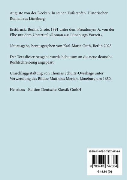 Auguste von der Decken: In seinen Fußstapfen. Historischer Roman aus LüneburgErstdruck: Berlin, Grote, 1891 unter dem Pseudonym A. von der Elbe mit dem Untertitel »Roman aus Lüneburgs Vorzeit«.Neuausgabe, herausgegeben von Karl-Maria Guth, Berlin 2023.Der Text dieser Ausgabe wurde behutsam an die neue deutsche Rechtschreibung angepasst.Umschlagabbildung: Matthäus Merian, Lüneburg um 1650Gesetzt aus der Minion Pro, 11 pt.Die Sammlung Hofenberg erscheint im Verlag Henricus - Edition Deutsche Klassik GmbH, Berlin