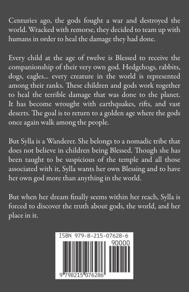 Centuries ago, the gods fought a war and destroyed the world. Wracked with remorse, they decided to team up with humans in order to heal the damage they had done. Every child at the age of twelve is Blessed to receive the companionship of their very own god. Hedgehogs, rabbits, dogs, eagles... every creature in the world is represented among their ranks. These children and gods work together to heal the terrible damage that was done to the planet. It has become wrought with earthquakes, rifts, and vast deserts. The goal is to return to a golden age where the gods once again walk among the people. But Sylla is a Wanderer. She belongs to a nomadic tribe that does not believe in children being Blessed. Though she has been taught to be suspicious of the temple and all those associated with it, Sylla wants her own Blessing and to have her own god more than anything in the world. But when her dream finally seems within her reach, Sylla is forced to discover the truth about gods, the world, and her place in it.