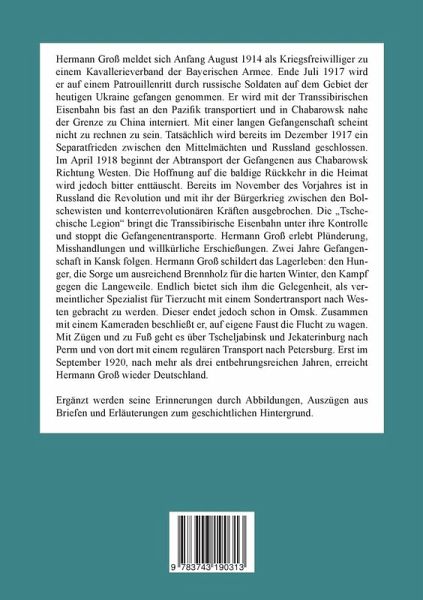 Hermann Groß meldet sich Anfang August 1914 als Kriegsfreiwilliger zu einem Kavallerieverband der Bayerischen Armee. Ende Juli 1917 wird er auf einem Patrouillenritt durch russische Soldaten auf dem Gebiet der heutigen Ukraine gefangen genommen. Er wird mit der Transsibirischen Eisenbahn bis fast an den Pazifik transportiert und in Chabarowsk nahe der Grenze zu China interniert. Mit einer langen Gefangenschaft scheint nicht zu rechnen zu sein. Tatsächlich wird bereits im Dezember 1917 ein Separatfrieden zwischen den Mittelmächten und Russland geschlossen. Im April 1918 beginnt der Abtransport der Gefangenen aus Chabarowsk Richtung Westen. Die Hoffnung auf die baldige Rückkehr in die Heimat wird jedoch bitter enttäuscht. Bereits im November des Vorjahres ist in Russland die Revolution und mit ihr der Bürgerkrieg zwischen den Bolschewisten und konterrevolutionären Kräften ausgebrochen. Die "Tschechische Legion" bringt die Transsibirische Eisenbahn unter ihre Kontrolle und stoppt die Gefangenentransporte. Hermann Groß erlebt Plünderung, Misshandlungen und willkürliche Erschießungen. Zwei Jahre Gefangenschaft in Kansk folgen. Hermann Groß schildert das Lagerleben: den Hunger, die Sorge um ausreichend Brennholz für die harten Winter, den Kampf gegen die Langeweile. Endlich bietet sich ihm die Gelegenheit, als vermeintlicher Spezialist für Tierzucht mit einem Sondertransport nach Westen gebracht zu werden. Dieser endet jedoch schon in Omsk. Zusammen mit einem Kameraden beschließt er, auf eigene Faust die Flucht zu wagen. Mit Zügen und zu Fuß geht es über Tscheljabinsk und Jekaterinburg nach Perm und von dort mit einem regulären Transport nach Petersburg. Erst im September 1920, nach mehr als drei entbehrungsreichen Jahren, erreicht Hermann Groß wieder Deutschland.Ergänzt werden seine Erinnerungen durch Abbildungen, Auszügen aus Briefen und Erläuterungen zum geschichtlichen Hintergrund.