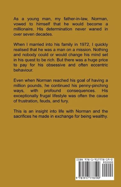 As a young man, my father-in-law, Norman, vowed to himself that he would become a millionaire. His determination never waned in over seven decades. When I married into his family in 1972, I quickly realised that he was a man on a mission. Nothing and nobody could or would change his mind set in his quest to be rich. But there was a huge price to pay for his obsessive and often eccentric behaviour. Even when Norman reached his goal of having a million pounds, he continued his penny-pinching ways, with profound consequences. His exceptionally frugal lifestyle was often the cause of frustration, feuds, and fury. This is an insight into life with Norman and the sacrifices he made in exchange for being wealthy.