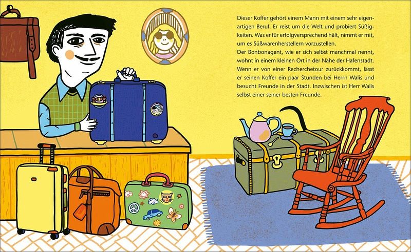 Das Buch erzählt von Herrn Walis, der in einer großen Hafenstadt eine Gepäckaufbewahrung betreibt. Mit ihm dürfen wir in sieben verschiedene Koffer und die dahinter verborgenen Geschichten schauen, die so manche Überraschung bereit halten…