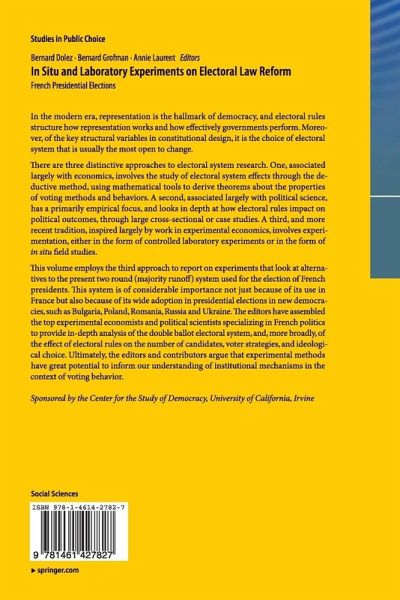 This volume employs the third approach to report on experiments that look at alternatives to the present two round (majority runoff) system used for the election of French presidents. This system is of considerable importance not just because of its use in France but also because of its wide adoption in presidential elections in new democracies, such as Bulgaria, Poland, Romania, Russia and Ukraine. The editors have assembled the top experimental economists and political scientists specializing in French politics to provide in-depth analysis of the double ballot electoral system, and, more broadly, of the effect of electoral rules on the number of candidates, voter strategies, and ideological choice. Ultimately, the editors and contributors argue that experimental methods have great potential to inform our understanding of institutional mechanisms in the context of voting behavior.