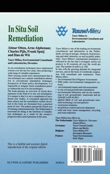 The book presents an overview of recent developments in the field of in situ soil remediation. The book is unique in that it is not a compilation of unrelated case studies. A conceptual approach has been chosen; remediation models described in this book are illustrated from a practical point of view. The authors present the Dutch way of treating contaminated land; The Netherlands is renowned for being at the forefront of remediation techniques as a result of the country's progressiveness and experience in this area.