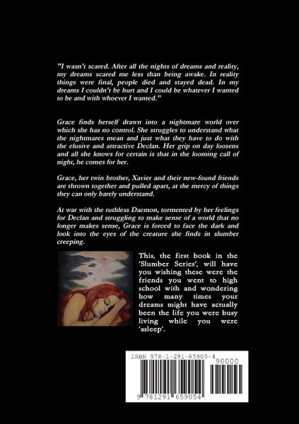 Grace finds herself drawn into a nightmare world over which she has no control. She struggles to understand what the nightmares mean and just what they have to do with the elusive and attractive Declan. Her grip on day loosens and all she knows for certain is that in the looming call of night, he comes for her. Grace, her twin brother Xavier and their new-found friends are thrown together and pulled apart, at the mercy of things they can only barely understand. At war with the ruthless Daemon, tormented by her feelings for Declan and struggling to make sense of a world that no longer makes sense, Grace is forced to face the dark and look into the eyes of the creature she finds in slumber creeping. This, the first book of the 'Slumber Series', will have you wishing these were the friends you went to high school with and wondering how many times your dreams might have actually been the life you were busy living while you were 'asleep'.