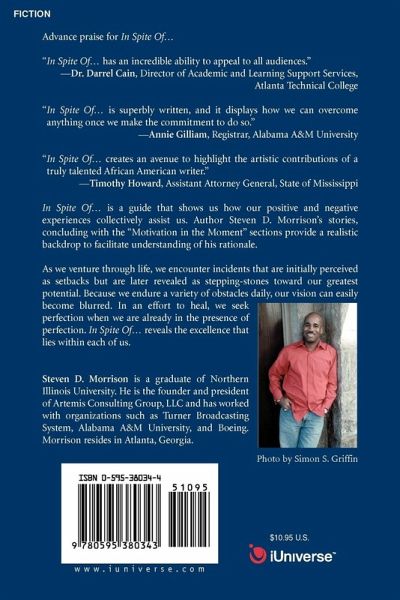 Advance praise for In Spite Of. "In Spite Of. has an incredible ability to appeal to all audiences." -Dr. Darrel Cain, Director of Academic and Learning Support Services, Atlanta Technical College "In Spite Of. is superbly written, and it displays how we can overcome anything once we make the commitment to do so." -Annie Gilliam, Registrar, Alabama A&M University "In Spite Of. creates an avenue to highlight the artistic contributions of a truly talented African-American writer." -Timothy Howard, Assistant Attorney General, State of Mississippi In Spite Of. is a guide that shows us how our positive and negative experiences collectively assist us. Author Steven D. Morrison's stories, concluding with the "Motivation in the Moment" sections, provide a realistic backdrop to facilitate understanding of his rationale. As we venture through life, we encounter incidents that are initially perceived as setbacks but are later revealed as stepping-stones toward our greatest potential. Because we endure a variety of obstacles daily, our vision can easily become blurred. In an effort to heal, we seek perfection when we are already in the presence of perfection. In Spite Of. reveals the excellence that lies within in each of us.