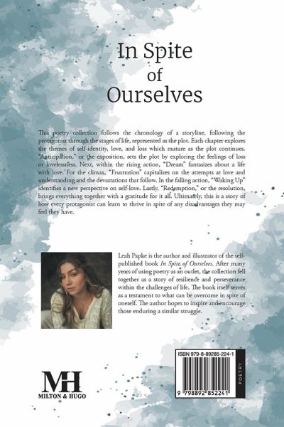 This poetry collection follows the chronology of a storyline, following the protagonist through the stages of life, represented as the plot. Each chapter explores the themes of self-identity, love, and loss which mature as the plot continues. "Anticipation," or the exposition, sets the plot by exploring the feelings of loss or lovelessness. Next, within the rising action, "Dream" fantasizes about a life with love. For the climax, "Frustration" capitalizes on the attempts at love and understanding and the devastations that follow. In the falling action, "Waking Up" identifies a new perspective on self-love. Lastly, "Redemption," or the resolution, brings everything together with a gratitude for it all. Ultimately, this is a story of how every protagonist can learn to thrive in spite of any disadvantages they may feel they have.