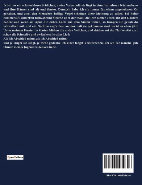 Es ist nur ein schmuckloses Städtchen, meine Vaterstadt; sie liegt in einer baumlosen Küstenebene, und ihre Häuser sind alt und finster. Dennoch habe ich sie immer für einen angenehmen Ort gehalten, und zwei den Menschen heilige Vögel scheinen diese Meinung zu teilen. Bei hoher Sommerluft schweben fortwährend Störche über der Stadt, die ihre Nester unten auf den Dächern haben; und wenn im April die ersten Lüfte aus dem Süden wehen, so bringen sie gewiß die Schwalben mit, und ein Nachbar sagt's dem andern, daß sie gekommen sind. So ist es eben jetzt. Unter meinem Fenster im Garten blühen die ersten Veilchen, und drüben auf der Planke sitzt auch schon die Schwalbe und zwitschert ihr altes Lied: Als ich Abschied nahm, als ich Abschied nahm; und je länger sie singt, je mehr gedenke ich einer längst Verstorbenen, der ich für manche gute Stunde meiner Jugend zu danken habe.