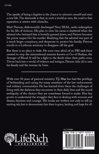 The upside of being a fugitive is the chance to reinvent oneself and start a new life. The downside is that, in such a world as ours, the road to that reparation is strewn with obstacles. Matt Pierson, dishonorably discharged Navy SEAL, seeks redemption for his life of violence. His plan to clear his name is shattered when the admiral who betrayed him is brutally gunned down, and Pierson becomes the prime suspect for his murder. Realizing that the admiral was part of a much larger conspiracy, and desperate to protect his family, Pierson enrolls in a Lutheran seminary to disappear off the grid. But there is no place to hide. He soon runs afoul of an FBI task force created to stop the international assassin known as Go-el Hadam, the Avenger of Blood. It will be a fight to the death when their paths cross. Thrust back into a world of violence and intrigue, Pierson risks all to save his family and the woman he loves.