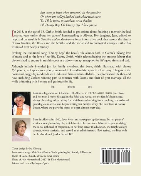 But come ye back when summer's in the meadow Or when the valley's hushed and white with snow 'Tis I'll be there, in sunshine or in shadow Oh Danny Boy, Oh Danny Boy, I love you so In 2015, at the age of 95, Cathie Smith decided to get serious about finishing a memoir she had started years earlier about her parents' homesteading in Alberta. Her daughter, Jean, offered to help, and the result is In Sunshine and in Shadow--a lively, informative book that records the history of two families, the Rosses and the Smiths, and the social and technological changes Cathie has witnessed over nearly a century. Evoking the traditional song "Danny Boy," the book's title alludes both to Cathie's lifelong love of music and to the love of her life, Danny Smith, while acknowledging the outdoor labour that pioneers had to endure in sunshine and in shadow--an apt metaphor for life's good times and bad. Although initially intended just for family members, this book, richly illustrated with almost 350 photos, will appeal to anybody interested in Canadian history or in a love story. It begins in the horse-and-buggy days and ends with industrial farms and no-till drills. It explores social life then and now, including Cathie's winding path to romance with Danny and their 66-year marriage, all the while brimming with her zest and gratitude for life.