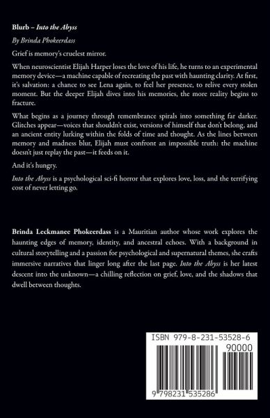 Blurb - Into the Abyss By Brinda Phokeerdass Grief is memory's cruelest mirror. When neuroscientist Elijah Harper loses the love of his life, he turns to an experimental memory device-a machine capable of recreating the past with haunting clarity. At first, it's salvation: a chance to see Lena again, to feel her presence, to relive every stolen moment. But the deeper Elijah dives into his memories, the more reality begins to fracture. What begins as a journey through remembrance spirals into something far darker. Glitches appear-voices that shouldn't exist, versions of himself that don't belong, and an ancient entity lurking within the folds of time and thought. As the lines between memory and madness blur, Elijah must confront an impossible truth: the machine doesn't just replay the past-it feeds on it. And it's hungry. Into the Abyss is a psychological sci-fi horror that explores love, loss, and the terrifying cost of never letting go.