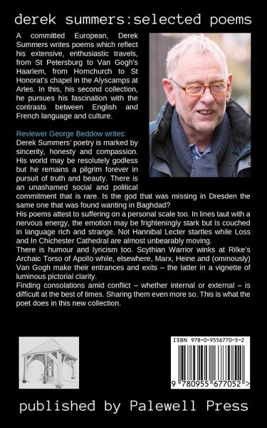 A committed European, Derek Summers writes poems which reflect his extensive, enthusiastic travels, from St Petersburg to Van Gogh's Haarlem, from Hornchurch to St Honorat’s chapel in the Alyscamps at Arles. In this, his second collection, he pursues his fascination with the contrasts between English and French language and culture. Reviewer George Beddow writes: Derek Summers’ poetry is marked by sincerity, honesty and compassion. His world may be resolutely godless but he remains a pilgrim forever in pursuit of truth and beauty. There is an unashamed social and political commitment that is rare. Is the god that was missing in Dresden the same one that was found wanting in Baghdad? His poems attest to suffering on a personal scale too. In lines taut with a nervous energy, the emotion may be frighteningly stark but is couched in language rich and strange. Not Hannibal Lecter startles while Loss and In Chichester Cathedral are almost unbearably moving. There is humour and lyricism too. Scythian Warrior winks at Rilke’s Archaic Torso of Apollo while, elsewhere, Marx, Heine and (ominously) Van Gogh make their entrances and exits – the latter in a vignette of luminous pictorial clarity. Finding consolations amid conflict – whether internal or external – is difficult at the best of times. Sharing them even more so. This is what the poet does in this new collection.