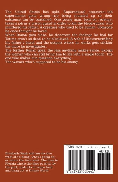 The United States has split. Supernatural creatures-lab experiments gone wrong-are being rounded up so their existence can be contained. One young man, bent on revenge, takes a job as a prison guard in order to kill the blood-sucker who murdered his father. A creature who used to be human. Someone he once thought he loved. When Ronan gets close, he discovers the feelings he had for Tatima aren't as dead as he'd believed. A web of lies surrounding his father's death and the outpost where he works gets stickier the more he investigates. The further Ronan goes, the less anything makes sense. Except the woman who can still bring him to life with a single touch. The one who makes him question everything. The woman who's supposed to be his enemy.