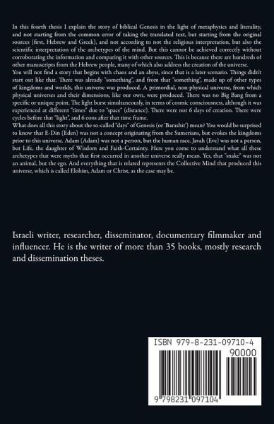 In this fourth thesis I explain the story of biblical Genesis in the light of metaphysics and literality, and not starting from the common error of taking the translated text, but starting from the original sources (first, Hebrew and Greek), and not according to not the religious interpretation, but also the scientific interpretation of the archetypes of the mind. But this cannot be achieved correctly without corroborating the information and comparing it with other sources. This is because there are hundreds of other manuscripts from the Hebrew people, many of which also address the creation of the universe. You will not find a story that begins with chaos and an abyss, since that is a later scenario. Things didn't start out like that. There was already "something", and from that "something", made up of other types of kingdoms and worlds, this universe was produced. A primordial, non-physical universe, from which physical universes and their dimensions, like our own, were produced. There was no Big Bang from a specific or unique point. The light burst simultaneously, in terms of cosmic consciousness, although it was experienced at different "times" due to "space" (distance). There were not 6 days of creation. There were cycles before that "light", and 6 eons after that time frame. What does all this story about the so-called "days" of Genesis (or 'Barashit') mean? You would be surprised to know that E-Din (Eden) was not a concept originating from the Sumerians, but evokes the kingdoms prior to this universe. Adam (Adam) was not a person, but the human race. Javah (Eve) was not a person, but Life, the daughter of Wisdom and Faith-Certainty. Here you come to understand what all these archetypes that were myths that first occurred in another universe really mean. Yes, that "snake" was not an animal, but the ego. And everything that is related represents the Collective Mind that produced this universe, which is called Elohim, Adam or Christ, as the case may be.