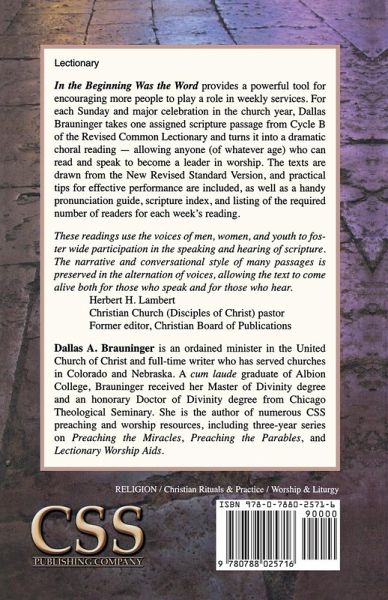 In the Beginning Was the Word provides a powerful tool for encouraging more people to play a role in weekly services. For each Sunday and major celebration in the church year, Dallas Brauninger takes one assigned scripture passage from Cycle B of the Revised Common Lectionary and turns it into a dramatic choral reading -- allowing anyone (of whatever age) who can read and speak to become a leader in worship. The texts are drawn from the New Revised Standard Version, and also included are practical tips for effective performance, as well as a handy pronunciation guide, scripture index, and listing of the required number of participants for each week's reading. These readings use the voices of men, women, and youth to foster wide participation in the speaking and hearing of scripture. The narrative and conversational style of many passages is preserved in the alternation of voices, allowing the text to come alive both for those who speak and for those who hear. Herbert H. Lambert Christian Church (Disciples of Christ) pastor Former editor, Christian Board of Publications Dallas A. Brauninger is an ordained minister in the United Church of Christ and full-time writer who has served churches in Colorado and Nebraska. A cum laude graduate of Albion College, Brauninger received her Master of Divinity degree and an honorary Doctor of Divinity degree from Chicago Theological Seminary. She is the author of numerous CSS preaching and worship resources, including three-year series on Preaching the Miracles, Preaching the Parables, and Lectionary Worship Aids.