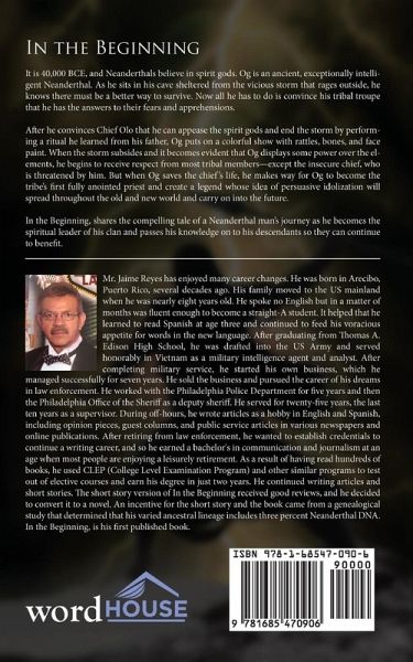 It is 40,000 BCE, and Neanderthals believe in spirit gods. Og is an ancient, exceptionally intelligent Neanderthal. As he sits in his cave sheltered from the vicious storm that rages outside, he knows there must be a better way to survive. Now all he has to do is convince his tribal troupe that he has the answers to their fears and apprehensions. After he convinces Chief Olo that he can appease the spirit gods and end the storm by performing a ritual he learned from his father, Og puts on a colorful show with rattles, bones, and face paint. When the storm subsides and it becomes evident that Og displays some power over the elements, he begins to receive respect from most tribal members-except the insecure chief, who is threatened by him. But when Og saves the chief's life, he makes way for Og to become the tribe's first fully anointed priest and create a legend whose idea of persuasive idolization will spread throughout the old and new world and carry on into the future. In the Beginning, shares the compelling tale of a Neanderthal man's journey as he becomes the spiritual leader of his clan and passes his knowledge on to his descendants so they can continue to benefit.