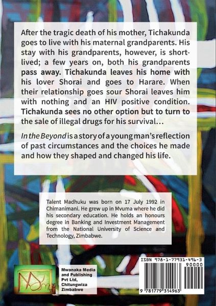 After the tragic death of his mother, Tichakunda goes to live with his maternal grandparents. His stay with his grandparents however was short-lived, a few years on, both his grandparents pass away. Tichakunda leaves his home with his lover Shorai and goes to Harare. When their relationship goes sour Shorai leaves him with nothing and an HIV positive condition. Tichakunda sees no other option but to turn to the sale of illegal drugs for his survival... In the Beyond is a story of a young man's reflection of past circumstances and the choices he made and how they shaped and changed his life. Talent Madhuku was born on 17 July 1992 in Chimanimani. He grew up in Mvuma where he did his secondary education. He holds an honours degree in Banking and Investment Management from the National University of Science and Technology, Zimbabwe.