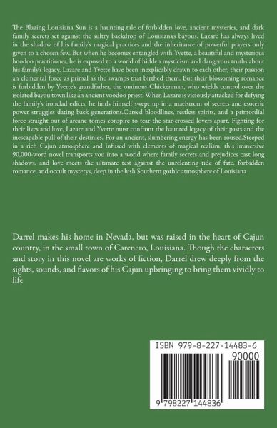 The Blazing Louisiana Sun is a haunting tale of forbidden love, ancient mysteries, and dark family secrets set against the sultry backdrop of Louisiana's bayous. Lazare has always lived in the shadow of his family's magical practices and the inheritance of powerful prayers only given to a chosen few. But when he becomes entangled with Yvette, a beautiful and mysterious hoodoo practitioner, he is exposed to a world of hidden mysticism and dangerous truths about his family's legacy. Lazare and Yvette have been inexplicably drawn to each other, their passion an elemental force as primal as the swamps that birthed them. But their blossoming romance is forbidden by Yvette's grandfather, the ominous Chickenman, who wields control over the isolated bayou town like an ancient voodoo priest. When Lazare is viciously attacked for defying the family's ironclad edicts, he finds himself swept up in a maelstrom of secrets and esoteric power struggles dating back generations.Cursed bloodlines, restless spirits, and a primordial force straight out of arcane tomes conspire to tear the star-crossed lovers apart. Fighting for their lives and love, Lazare and Yvette must confront the haunted legacy of their pasts and the inescapable pull of their destinies. For an ancient, slumbering energy has been roused.Steeped in a rich Cajun atmosphere and infused with elements of magical realism, this immersive 90,000-word novel transports you into a world where family secrets and prejudices cast long shadows, and love meets the ultimate test against the unrelenting tide of fate, forbidden romance, and occult mysterys, deep in the lush Southern gothic atmosphere of Louisiana