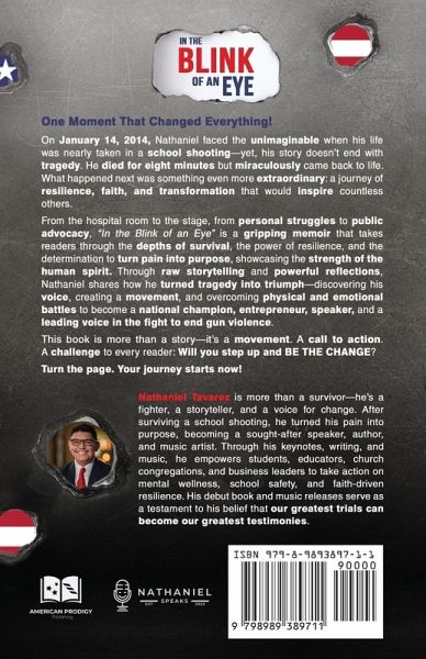 One moment changed everything. On January 14, 2014, Nathaniel Tavarez's life was nearly taken in a school shooting. He died for eight minutes-and miraculously came back to life. But what followed was even more extraordinary: a journey of resilience, faith, and transformation that would inspire countless others. In In the Blink of an Eye, Nathaniel takes you on a powerful journey from the depths of survival to the heights of purpose, showing how he turned tragedy into an unstoppable mission. Through raw storytelling and heartfelt reflection, he shares how he fought through physical and emotional battles, found his voice, and built a movement to change lives. From the hospital room to the stage, from doubt to determination, Nathaniel's journey unfolds in unexpected ways. He overcame adversity to become a national champion, an entrepreneur, a keynote speaker, and a leading advocate for ending gun violence. But this book is more than just a story. It's a movement. A call to action. Inside these pages, you will discover: ¿The power of faith and resilience in overcoming life's darkest moments ¿The truth behind healing, forgiveness, and finding your purpose ¿How we can take real steps to create safer schools, events, and communities ¿A challenge to every reader: Will YOU step up and BE THE CHANGE? Turn the page. Your journey starts now.