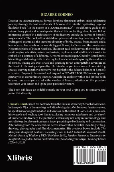 BIZARRE BORNEO Discover the untamed paradise, Borneo. For those planning to embark on an exhilarating journey through the lush rainforests of Borneo, dive into the captivating pages of this latest book " In the Bosom of BIZARRE BORNEO" - the definitive guide to the extraordinary plant and animal species that call this enchanting island home. Before immersing yourself in a rich tapestry of biodiversity, unlock the secrets of Borneo's magical realm. The book offers vivid descriptions and stunning drawings of highly endangered mammals, the immense diversity of birds, snakes, frogs, insects and a host of rare plants such as the world's biggest flower, Rafflesia, and the carnivorous Nepenthes plants of Mount Kinabalu. This must-read book unveils the wonders that await, urging scientists, nature enthusiasts, explorers, and wildlife aficionados to embark on a journey of a lifetime. A retired immunologist, Ghazally Ismail, turns his writing and drawing skills to sharing his four-decades of exploring the rainforests of Borneo, leaving you awe-struck and yearning for an unforgettable adventure in the heart of this ecological paradise. He introduces you to an array of breathtaking species, weaving together a narrative that highlights the delicate balance of Borneo's ecosystem. Prepare to be amazed and inspired as BIZARRE BORNEO opens up your gateway to an extraordinary journey. Unleash the explorer within and let this book be your compass as you marvel at the wonders of Borneo, a destination that promises to awaken your senses and ignite your passion for nature. The book will leave an indelible mark on your soul urging you to conserve and protect biodiversity.