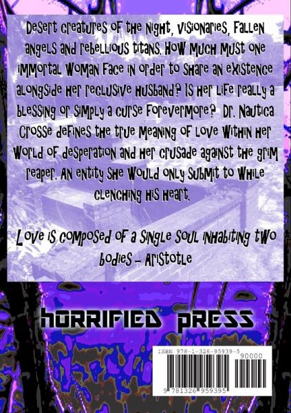 Desert creatures of the night, visionaries, fallen angels and rebellious titans. How much must one immortal woman face in order to share an existence alongside her reclusive husband? Is her life really a blessing or simply a curse forevermore? Dr. Nautica Crosse defines the true meaning of love within her world of desperation and her crusade against the grim reaper. An entity she would only submit to while clenching his heart. Love is composed of a single soul inhabiting two bodies - Aristotle Is the afterlife filled by half souls? A quest of one woman's love as she faces the horrors that surround the figure of her visual passion. Is she any different from the evil forces that she contends with? She herself creates a monster but without malice. A monster for which she has joined as the two become one.