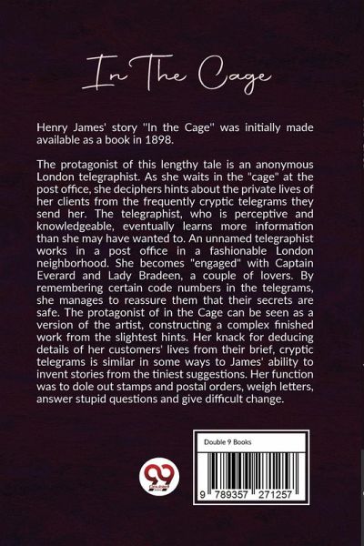 Henry James' story ''In the Cage'' was initially made available as a book in 1898. The protagonist of this lengthy tale is an anonymous London telegraphist. As she waits in the "cage" at the post office, she deciphers hints about the private lives of her clients from the frequently cryptic telegrams they send her. The telegraphist, who is perceptive and knowledgeable, eventually learns more information than she may have wanted to. An unnamed telegraphist works in a post office in a fashionable London neighborhood. She becomes "engaged" with Captain Everard and Lady Bradeen, a couple of lovers.…mehr