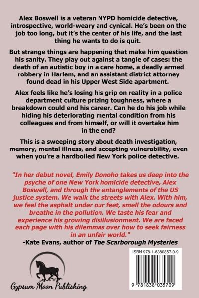 Alex Boswell is a veteran NYPD homicide detective, introspective, world-weary and cynical. He's been on the job too long, but it's the center of his life, and the last thing he wants to do is quit. But strange things are happening that make him question his sanity. They play out against a tangle of cases: the death of an autistic boy in a care home, a deadly armed robbery in Harlem, and an assistant district attorney found dead in his Upper West Side apartment. Alex feels like he's losing his grip on reality in a police department culture prizing toughness, where a breakdown could end his career. Can he do his job while hiding his deteriorating mental condition from his colleagues and from himself, or will it overtake him in the end? This is a sweeping story about death investigation, memory, mental illness, and accepting vulnerability, even when you're a hardboiled New York police detective.