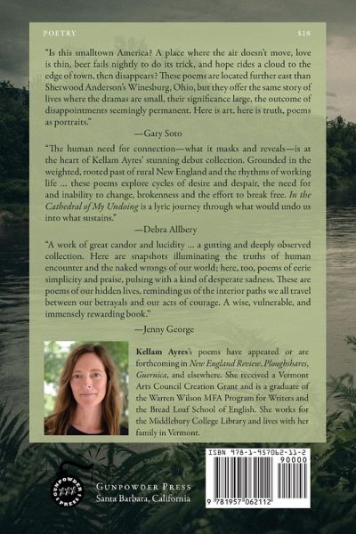 "Is this smalltown America? A place where the air doesn't move, love is thin, beer fails nightly to do its trick, and hope rides a cloud to the edge of town, then disappears? These poems are located further east than Sherwood Anderson's Winesburg, Ohio, but they offer the same story of lives where the dramas are small, their significance large, the outcome of disappointments seemingly permanent. Here is art, here is truth, poems as portraits."-Gary Soto, Final Judge, Barry Spacks Poetry Prize "A work of great candor and lucidity, In the Cathedral of My Undoing is a gutting and deeply observed collection. Everything Ayres' eye falls on takes on a stark clarity. Her straightforward lines disguise an enormous intelligence and tonal sensitivity: a fierce capacity for finding the emotional heart of things. I admire the deep attentiveness in these poems - the frontal gazes at the pain and strangeness of our most intimate connections and losses. Here are snapshots illuminating the truths of human encounter and the naked wrongs of our world; here, too, poems of eerie simplicity and praise, pulsing with a kind of desperate sadness. These are poems of our hidden lives, reminding us of the interior paths we all travel between our betrayals and our acts of courage. A wise, vulnerable, and immensely rewarding book."-Jenny George, author of The Dream of Reason "The human need for connection-what it masks and reveals-is at the heart of Kellam Ayres' stunning debut collection. Grounded in the weighted, rooted past of rural New England and the rhythms of working life, and given expansive resonance in the intimate spaces of the speaker's retrospective present, these poems explore cycles of desire and despair, the need for and inability to change, brokenness and the effort to break free. "I can't possibly protect my heart from this world," our speakerrecognizes in the final section, but the reader is witness throughout to her evolving resilience and self-sufficiency. In the Cathedral of My Undoing is a lyric journey through what would undo us into what sustains."-Debra Allbery, author of Fimbul-Winter