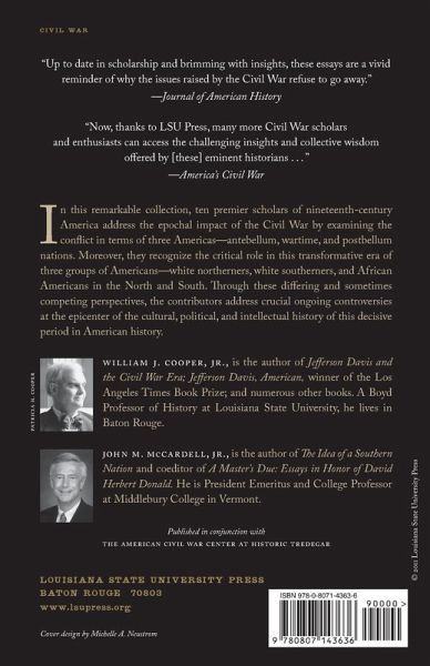 In this remarkable collection, ten premier scholars of nineteenth-century America address the epochal impact of the Civil War by examining the conflict in terms of three Americas -- antebellum, wartime, and postbellum nations. Moreover, they recognize the critical role in this transformative era of three groups of Americans -- white northerners, white southerners, and African Americans in the North and South. Through these differing and sometimes competing perspectives, the contributors address crucial ongoing controversies at the epicenter of the cultural, political, and intellectual history of this decisive period in American history. Coeditors William J. Cooper, Jr., and John M. McCardell, Jr., introduce the collection, which contains essays by the foremost Civil War scholars of our time: James M. McPherson considers the general import of the war; Peter S. Onuf and Christa Dierksheide examine how patriotic southerners reconciled slavery with the American Revolutionaries' faith in the new nation's progressive role in world history; Sean Wilentz attempts to settle the long-standing debate over the reasons for southern secession; and Richard Carwardine identifies the key wartime contributors to the nation's sociopolitical transformation and the redefinition of its ideals. George C. Rable explores the complicated ways in which southerners adopted and interpreted the terms "rebel" and "patriot," and Chandra Manning finds three distinct understandings of the relationship between race and nationalism among Confederate soldiers, black Union soldiers, and white Union soldiers. The final three pieces address how the country dealt with the meaning of the war and its memory: Nina Silber discusses the variety of ways we continue to remember the war and the Union victory; W. Fitzhugh Brundage tackles the complexity of Confederate commemoration; and David W. Blight examines the complicated African American legacy of the war. In conclusion, McCardell suggests the challenges and rewards of using three perspectives for studying this critical period in American history. Presented originally at the "In the Cause of Liberty" symposium hosted by The American Civil War Center at Historic Tredegar in Richmond, Virginia, these incisive essays by the most respected and admired scholars in the field are certain to shape historical debate for years to come.