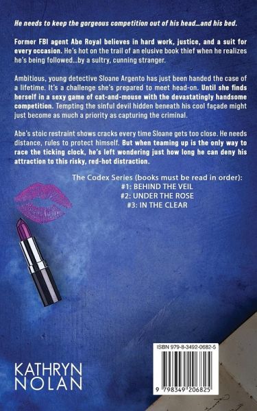 He needs to keep the gorgeous competition out of his head...and his bed. Former FBI agent Abe Royal believes in hard work, justice, and a suit for every occasion. He's hot on the trail of an elusive book thief when he realizes he's being followed...by a sultry, cunning stranger. Ambitious, young detective Sloane Argento has just been handed the case of a lifetime. It's a challenge she's prepared to meet head-on. Until she finds herself in a sexy game of cat-and-mouse with the devastatingly handsome competition. Tempting the sinful devil hidden beneath his cool façade might just become as much a priority as capturing the criminal. Abe's stoic restraint shows cracks every time Sloane gets too close. He needs distance, rules to protect himself. But when teaming up is the only way to race the ticking clock, he's left wondering just how long he can deny his attraction to this risky, red-hot distraction. The Codex Series (books must be read in order): #1 BEHIND THE VEIL #2 UNDER THE ROSE #3 IN THE CLEAR