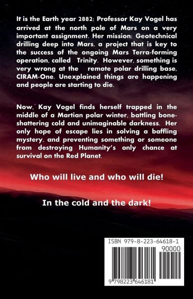 It is the Earth year 2882; Professor Kay Vogel has arrived at the north pole of Mars on a very important assignment. Her mission, geotechnical drilling deep into Mars, a project that is key to the success of the ongoing Mars Terra-forming operation, called Trinity. However, something is very wrong at the remote polar drilling base, CIRAM-One. Unexplained things are happening and people are starting to die. Now, Kay Vogel finds herself trapped in the middle of a Martian polar winter, battling bone-shattering cold and unimaginable darkness. Her only hope of escape lies in solving a baffling mystery, and preventing something or someone from destroying Humanity's only chance at survival on the Red Planet. Who will live and who will die! In the cold and the dark!