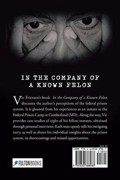 Vic Frierson's book In the Company of a Known Felon discusses the author's perceptions of the federal prison system. It is gleaned from his experiences as an inmate at the Federal Prison Camp at Cumberland (MD). Along the way, Vic provides case studies of eight of his fellow inmates, obtained through personal interviews. Each man openly tells his intriguing story, as well as shares his individual insights about the prison system, its shortcomings and missed opportunities.