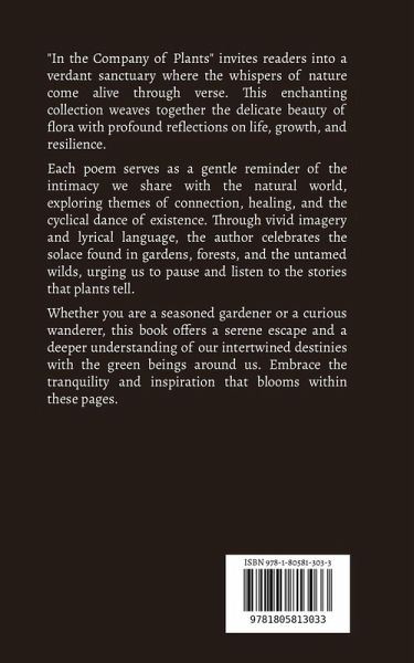 "In the Company of Plants" invites readers into a verdant sanctuary where the whispers of nature come alive through verse. This enchanting collection weaves together the delicate beauty of flora with profound reflections on life, growth, and resilience. Each poem serves as a gentle reminder of the intimacy we share with the natural world, exploring themes of connection, healing, and the cyclical dance of existence. Through vivid imagery and lyrical language, the author celebrates the solace found in gardens, forests, and the untamed wilds, urging us to pause and listen to the stories that plants tell. Whether you are a seasoned gardener or a curious wanderer, this book offers a serene escape and a deeper understanding of our intertwined destinies with the green beings around us. Embrace the tranquility and inspiration that blooms within these pages.