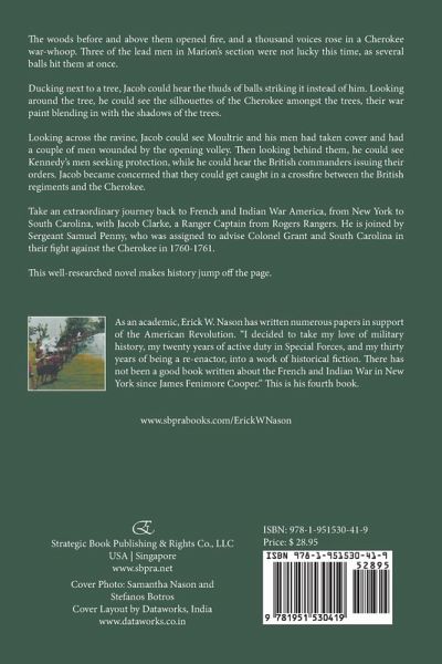 The woods before and above them opened fire, and a thousand voices rose in a Cherokee war-whoop. Three of the lead men in Marion’s section were not lucky this time, as several balls hit them at once. Ducking next to a tree, Jacob could hear the thuds of balls striking it instead of him. Looking around the tree, he could see the silhouettes of the Cherokee amongst the trees, their war paint blending in with the shadows of the trees. Looking across the ravine, Jacob could see Moultrie and his men had taken cover and had a couple of men wounded by the opening volley. Then looking behind them, he could see Kennedy’s men seeking protection, while he could hear the British commanders issuing their orders. Jacob became concerned that they could get caught in a crossfire between the British regiments and the Cherokee. Take an extraordinary journey back to French and Indian War America, from New York to South Carolina, with Jacob Clarke, a Ranger Captain from Rogers Rangers. He is joined by Sergeant Samuel Penny, who was assigned to advise Colonel Grant and South Carolina in their fight against the Cherokee in 1760-1761. This well-researched novel makes history jump off the page. As an academic, Erick W. Nason has written numerous papers in support of the American Revolution. "I decided to take my love of military history, my twenty years of active duty in Special Forces, and my thirty years of being a re-enactor, into a work of historical fiction. There has not been a good book written about the French and Indian War in New York since James Fenimore Cooper." This is his fourth book.