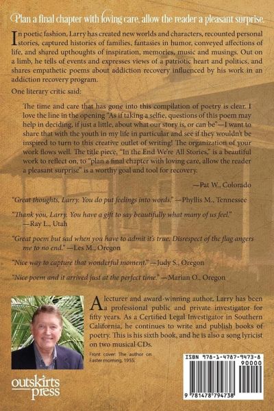 Plan life's chapter with loving care, allow the reader a pleasant surprise. In poetic fashion, Larry has created new worlds and characters, recounted personal stories, captured histories of families, fantasies in humor, conveyed affections of life, and shared upthoughts of inspiration, memories, music and musings. Out on a limb, he tells of events and expresses views of a patriotic heart and politics, and shares empathetic poems about addiction recovery influenced by his work in an addiction recovery program. One literary critic said, "The time and care that has gone into this compilation of poetry is clear. I love the line in the opening 'As if taking a selfie, questions of this poem may help in deciding, if just a little, about what our story is, or can be' - I want to share that with the youth in my life in particular and see if they wouldn't be inspired to turn to this creative outlet of writing! The title piece, In the End We're All Stories, is a beautiful work to reflect on, to 'plan a final chapter with loving care, allow the reader a pleasant surprise' is a worthy goal and tool for recovery.' Pat W.-Colorado