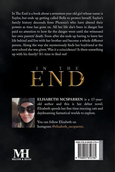 In the End is a book about a seventeen year old girl whose name is Saylor, but ends up getting called Bella to protect herself. Saylor's family history descends from Phoenix's who have altered their powers as time has gone on. All her life she's been in danger but paid no attention to how far the danger went until she witnessed her own parents' death. Soon after she ends up having to leave her life behind and live with her brother and become a whole different person. Along the way she mysteriously finds her boyfriend at the new school she was given. Was it a coincidence? Is there something up with his family? It's time to find out!