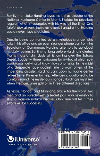 Family man Jake Harding loves his job as director of the National Hurricane Center in Miami, Florida; he practices regular "what if" scenarios with his wife all the time. One fateful day at work, however, events transpire that Harding could never have predicted. Despite being confronted by a mysterious stranger who lurks in his office and an even stranger phone call from the Secretary of Commerce, Harding attempts to go about his daily routine. But it is not long before Harding is alerted that a mass of dry, dusty air is forming over the Sahara Desert. Suddenly, three hurricanes form-two of which spin backwards, defying all known laws of physics. In the midst of a desperate race against time to warn others of the impending disaster, Harding calls upon hurricane center retiree Lester Philester for help. After being cautioned to be careful around the mysterious stranger, Harding is mystified when the hurricanes split off in three different directions. As Texas, Florida, and Maryland brace for the worst, two men and an outsider with a secret past work feverishly to stop a massive natural disaster. Only time will tell if their efforts will be successful.