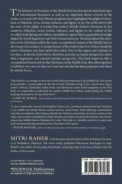 The situation of Christians in the Middle East has become an important topic of international discussion as well as an important theme covered in the media, as several CBS Sixty Minutes programs have highlighted the plight of Christians in Palestine, Syria, Jordan, Lebanon, and Egypt. In the Eye of the Storm tells the story of the plight of twenty-first-century Middle Eastern Christians in five countries (Palestine, Israel, Jordan, Lebanon, and Egypt) in the context of the so-called Arab Spring and within a destabilized region that is a geopolitical triangle shaped by Israeli hegemony and Arab-Iranian tensions. The book places the situation of the Christians within the wider sociopolitical context of the Middle East in the twenty-first century. A unique feature of this book is that it is written mainly by native Christians who have spent their entire lives in the region and continue to live there. In the Eye of the Storm, therefore, provides an insider perspective rather than a hegemonic and colonial outsider perspective. This book hopes to offer a sociopolitical framework for the Christians of the Middle East, thus allowing them to tell their own story as they see it and not one that has been projected onto them by outside forces.