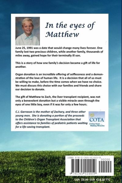 This is a true story about the gift of life. In one day, two precious children were lost, but thanks to a generous and selfless donation, the organ of one child was transplanted into a young boy thousands of miles a way, giving him and his family a hope for a new life. The gift of Matthew to Zach, the liver transplant recipient, was not only a benevolent donation, but a visible miracle seen through the eyes of one little boy, even if it was only for a few hours. Also available in French. Search "Les Yeux de Matthew"