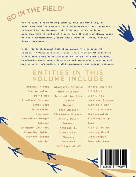 From obscure, blood-drinking canines, like the Devil Dog, to large, cave-dwelling monsters, like Pipisanguisuge, and legendary entities, like the Mothman, join Ballyraven on an exciting expedition into the unknown! Stories told through sketchbook pages and their accompaniments, learn about cryptids, aliens, mythical figures, and more. In the Field: Sketchbook Collection Volume Five contains 40 sketches, 40 Organism Summary pages, and convenient QR code links to read more about each! Connected to the In the Field archives, encyclopedia pages update frequently and are always expanding with more artwork, information, sightings/accounts, and podcast episodes. Includes: Roswell Aliens Corpse Walker Devil Dog Woodland Crooner Devil Bird Skin-Walker Stoneman Cumberland Dragon Jotunaq Snaggle-Tooth Roc Whooping Spider Thunder Beings Wendigo Atargatis Mermaid Ohio Grassman Tropical Basilisk Tlanuwa Dewayo Snallygaster Flatwoods Monster Jersey Devil Mothman Mothman II Stone Coat Phoenix Beastmen Halflings of WV Tundra Basilisk Msi-Pissi Snarly Yow Loveland Frogman Vegetable Man Grafton Monster Sheepsquatch Pipisanguisuge Ogua Faeries of WV Leaping Devil Cattawampus Mountain Mama