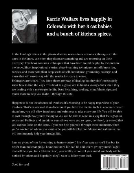 In the Findings refers to the phrase doctors, researchers, scientists, therapists ... the ones in the know, use when they discover something and are reporting on their discovery. This book contains techniques that have been found helpful by the ones in the know. Short inspirational stories, deep-breathing techniques, mindfulness tips and recipes, and more will plant deep seeds of self-confidence, grounding, and courage that will surely stay with the reader for years to come. Teenagers are smart. They know there are ways of dealing but they don't necessarily know how to find the ways. This book is a great tool to hand a young adults when they are dealing with a not so gentle life.