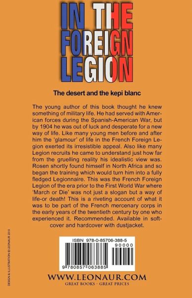 The desert and the kepi blanc The young author of this book thought he knew something of military life. He had served with American forces during the Spanish-American War, but by 1904 he was out of luck and desperate for a new way of life. Like many young men before and after him the 'glamour' of life in the French Foreign Legion exerted its irresistible appeal. Also like many Legion recruits he came to understand just how far from the gruelling reality his idealistic view was. Rosen shortly found himself in North Africa and so began the training which would turn him into a fully fledged Legionnaire. This was the French Foreign Legion of the era prior to the First World War where 'March or Die' was not just a slogan but a way of life-or death! This is a riveting account of what it was to be part of the French mercenary corps in the early years of the twentieth century by one who experienced it. Recommended. Available in softcover and hardcover with dustjacket.