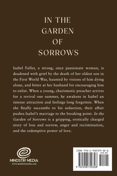 "Isabel Fuller, a strong, once passionate woman, is deadened with grief by the death of her oldest son in the First World War, haunted by visions of him dying alone, and bitter at her husband for encouraging him to enlist. When a young, charismatic preacher arrives for a revival one summer, he awakens in Isabel an intense attraction and feelings long forgotten. When she finally succumbs to his seduction, their affair pushes Isabel's marriage to the breaking point. In the Garden of Sorrows is a gripping, erotically charged story of loss and sorrow, anger and recrimination, and the redemptive power of love." -- back cover